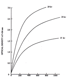 The data points of the net optical density values at 435nm resulting from EVC flood gun exposure at 30kv are shown in the figure for comparison.